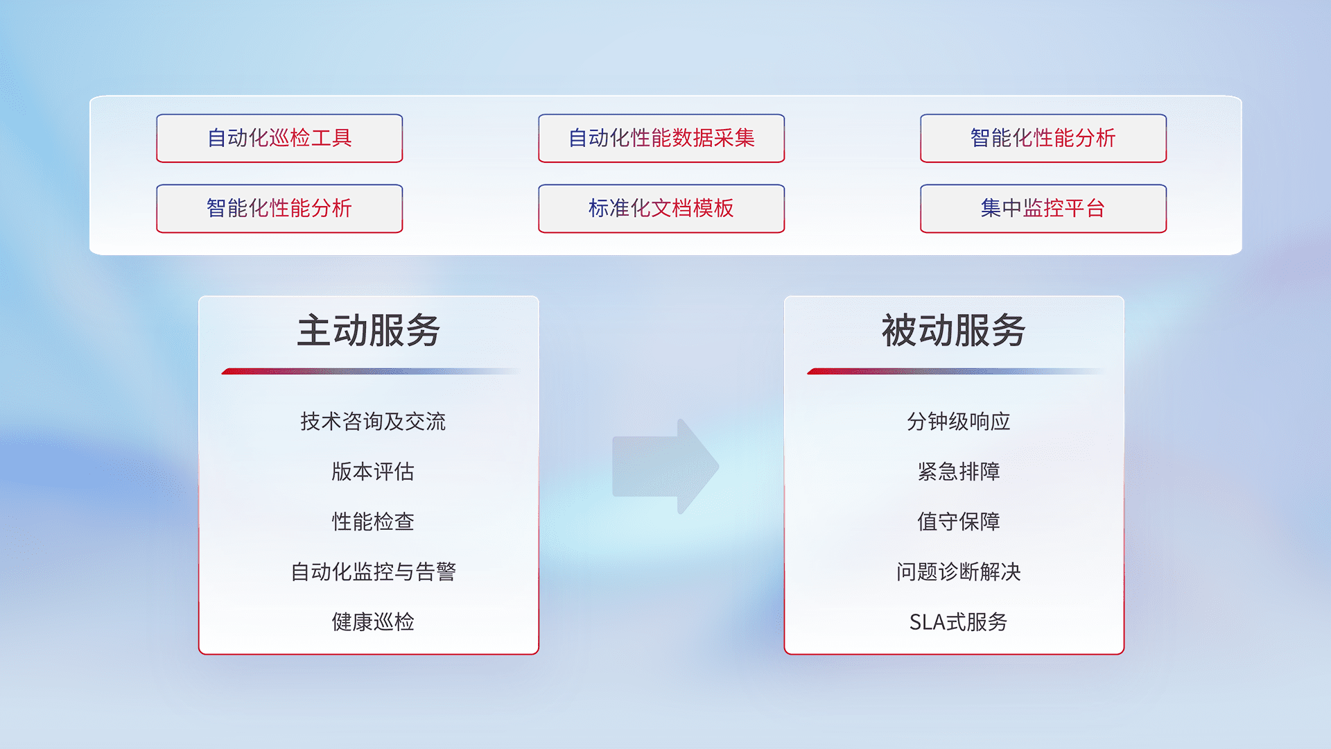 智能化工具和标准化文档,,,,保障服务质量,,,提供主动服务(包含技术咨询、、、、版本评估、、、、性能检查、、、、自动化监控与告警、、、、健康巡检)和被动服务包含(分钟级响应、、紧急排障、、、值守保障、、问题诊断解决、、SLA服务)。。。。