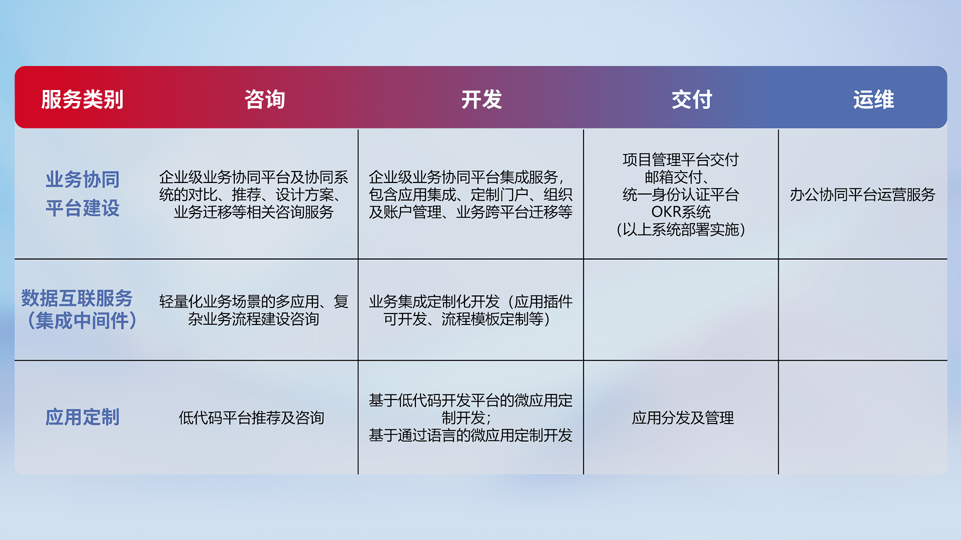 针对钉钉、、、企微、、IDaas等平台级产品提供产品的规划、、、、方案、、、、交付、、定制化开发等服务,,,,实现如统一协同办公、、智能客户服务、、、、混合会议管理、、、智能数据查询、、、等业务场景,,实现数字化转型。。